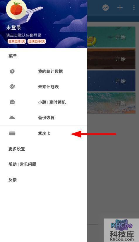 1、大家若是想在番茄todo里使用微信充值,那就需要先点击页面左上角的按钮,打开个人功能列表选择“季度卡”功能进行充值。