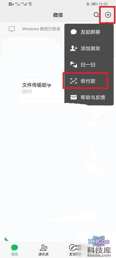 1、打开微信,点击左上角的【+】在弹出的选项中点击【收付款】;