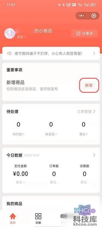3、如果无上方按钮,下滑找到“我的商品”,点击右侧的【新增商品】即可;