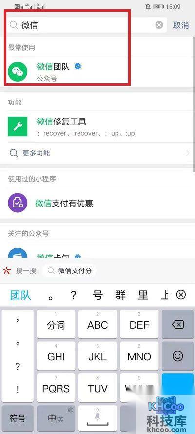 2、在搜索框中点击输入【微信团队】,在搜索结果出现后点击【微信团队】进入到程勋中;
