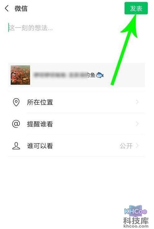 3、打开朋友圈发布界面添加文字描述,然后设置位置和好友观看权限,设置完毕点击“发表”。