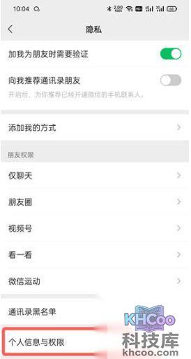 3、点击隐私设置中最下方的【个人信息与权限】;