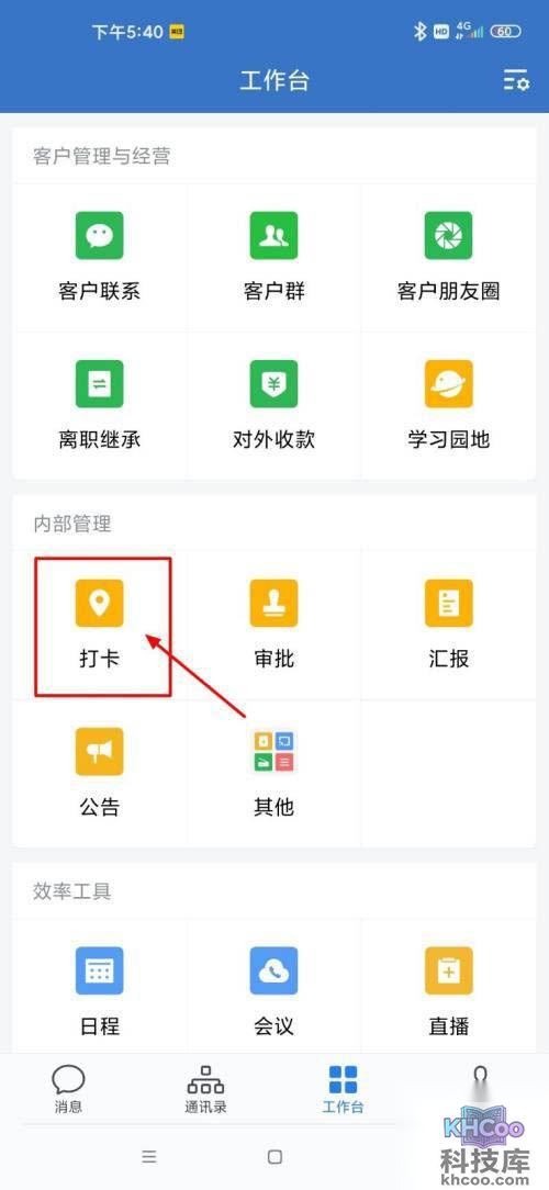 1、打开企业微信,点击工作台,点击打卡。