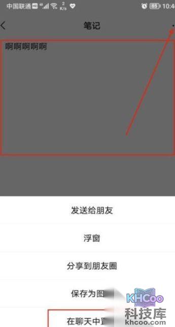 找到需要顶置的笔记点击,点击后右上角有【三个点】点击,在页面中下面找到【在 聊天 中顶置】点击设置。