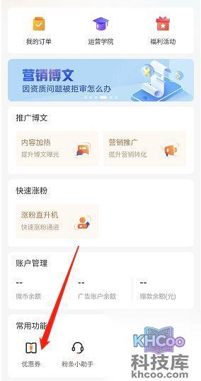 我们在微博上可以进行各种 社交 活动,还能在粉丝 头条 进行各种推广服务。我们在这里还可以获得优惠券,这样就可以获得更多的便利了。以下就是小编为你带来的查找方法,希望可以帮助到你。