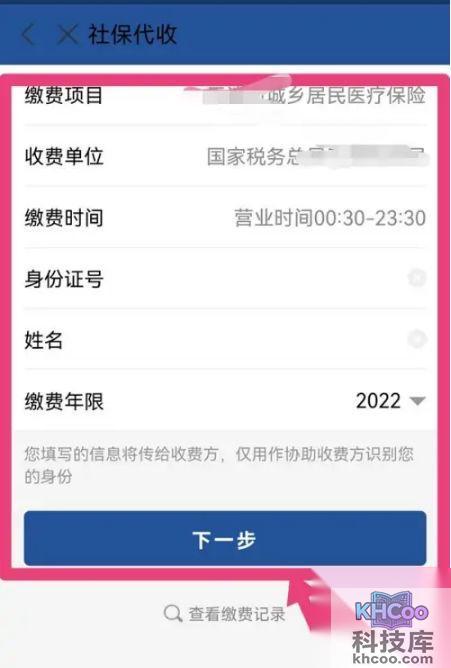在新页面中输入缴费人员的身份证等信息点击下一步,进行缴费。