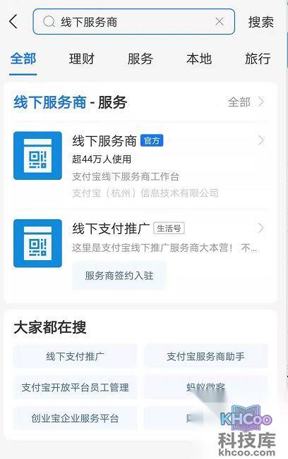 2、 开通方法: 打开手机中的支付宝app,点击上方 搜索 “线下服务商”打开。