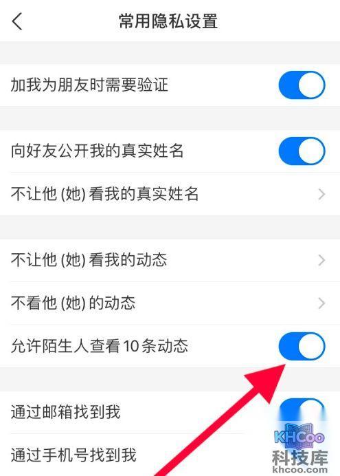 4、跳转到“常用隐私设置”界面之后,将“允许陌生人查看10条动态”右侧的滑块滑到最左侧