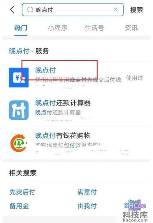 2、第二步点击搜索图标之后,搜索晚点付,点击进去