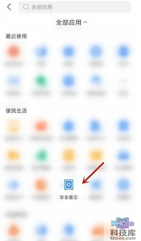 2、然后字啊辨明 生活 找到安全备忘点击打开,或者大家也可以直接在上方 搜索 进入