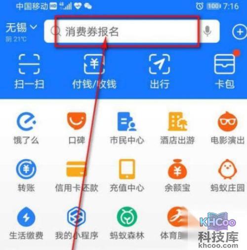 1、进入支付宝“首页”,点击顶部的 搜索 框。