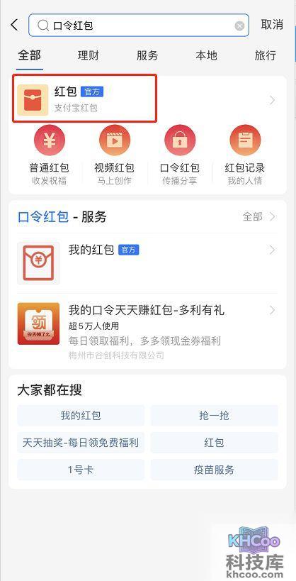 1.进入支付宝首页,在上方 搜索 框内输入“口令红包”