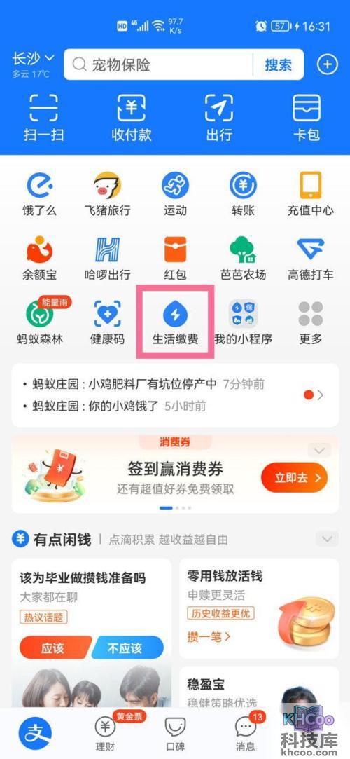 1、打开支付宝首页,点击进入 生活缴费 。