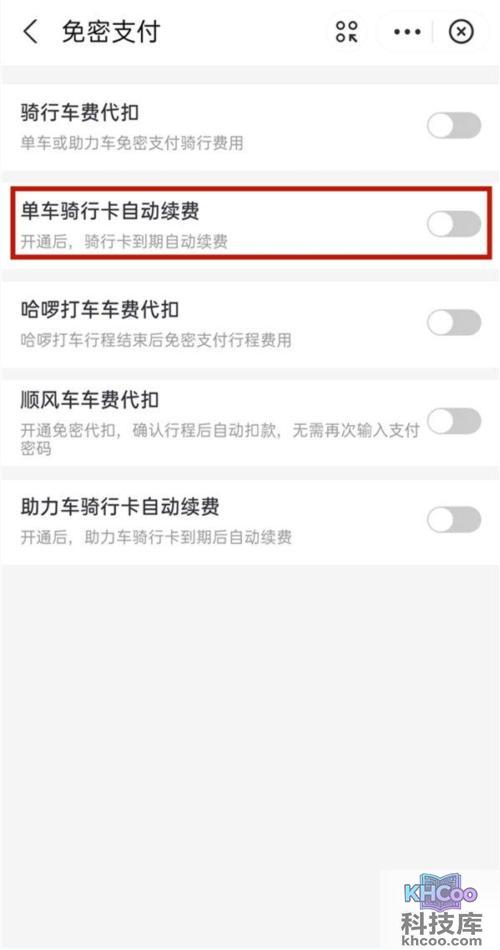 3、在免密支付中,将单车骑行卡自动续费右侧的按钮关闭就可以了。