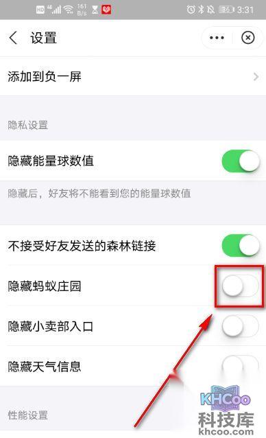 7、 按钮跳转为绿色时,蚂蚁庄园隐藏成功。