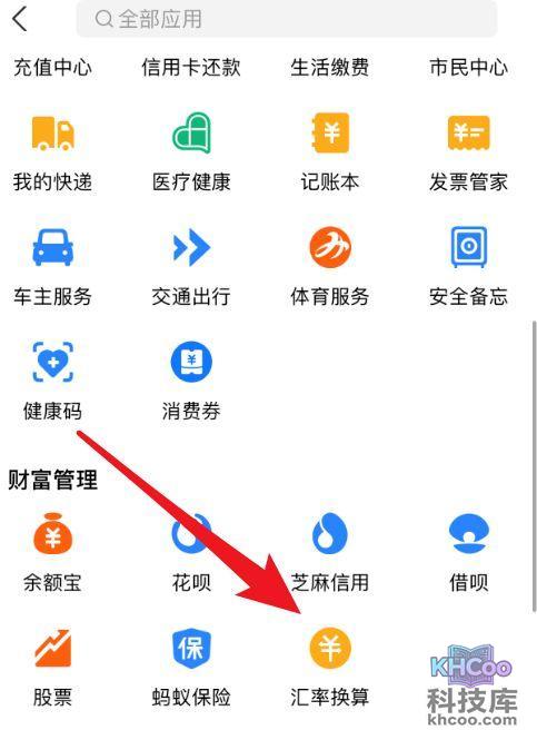 3、在全部应用页面中,找到【财富管理】一栏,并点击其中的【汇率换算】选项