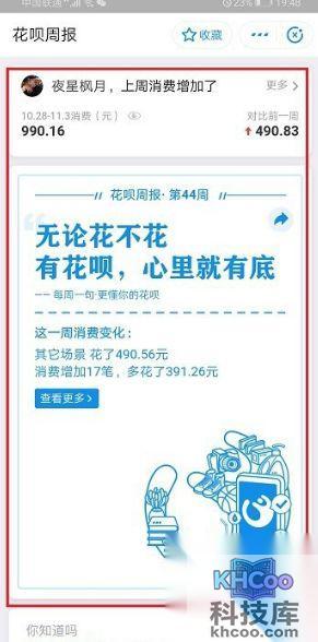 4、这就是我们的花呗周报了,点击页面上的“查看更多”。